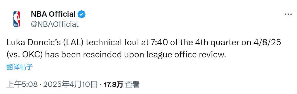 北京时间4月10日,NBA官方宣布撤销湖人队球星卢卡-东契奇在上一场输给俄克拉荷马城雷霆队比赛中吃到的第二次技术犯规。当时东契奇领到这次技犯后被驱逐,湖人从领先到落后,最终崩盘输球。只能说这次驱逐太冤,湖人本有机会双杀雷霆。