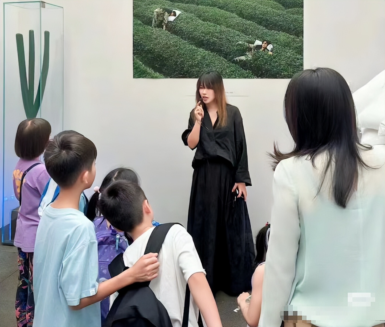 相中,身穿透明薄纱上衣搭墨绿色吊带衫的郭晶晶,陪着孩子们认真听讲解员科普,两女一子也是听得津津有味。