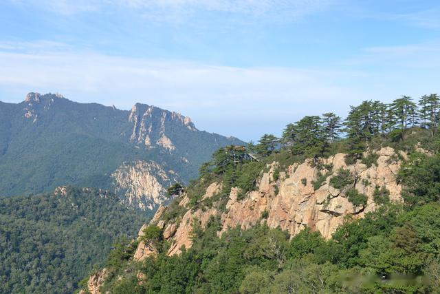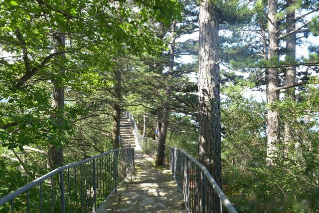 沿着木栈道一路下行,可以远观远方的金雕崖。金雕崖山势雄伟,悬崖峭壁高耸入云。崖壁周围森林茂密,郁郁葱葱的树木犹如绿色的海洋,空气清新纯净。