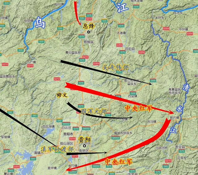 如上图所示,毛主席一看调敌目的已经达到,就命令红军从贵阳、龙里之间穿插而过,一路向西,朝着云南方向急进。