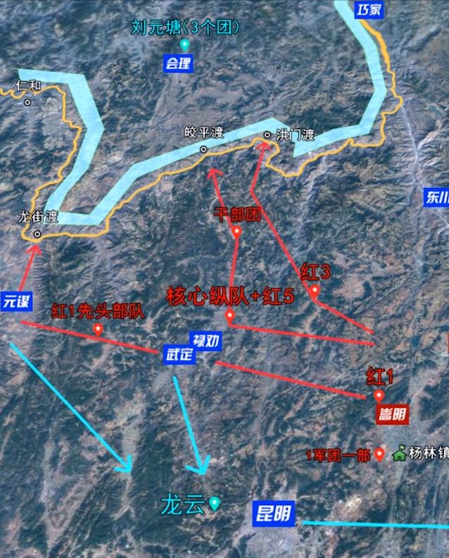 如图,金沙江的渡口从西往东,依次是仁和、龙街渡、皎平渡、洪门渡、巧家五个渡口。这五个渡口,最好过的是仁和渡口和巧家渡口,这两地地形开阔、水流平缓,容易架桥。但是距离过远,而且容易被老蒋猜到。