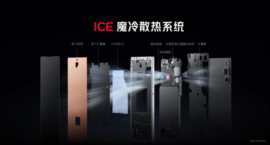 为了确保高性能的输出,红魔10 Air传承散热王者基因,搭载全新ICE魔冷散热系统。该系统采用复合液态金属2.0,三明治结构2.0搭配超大3D冰阶VC与石墨烯散热片,有效降低核心温度,让手机在高负载下依然“保持冷静”。