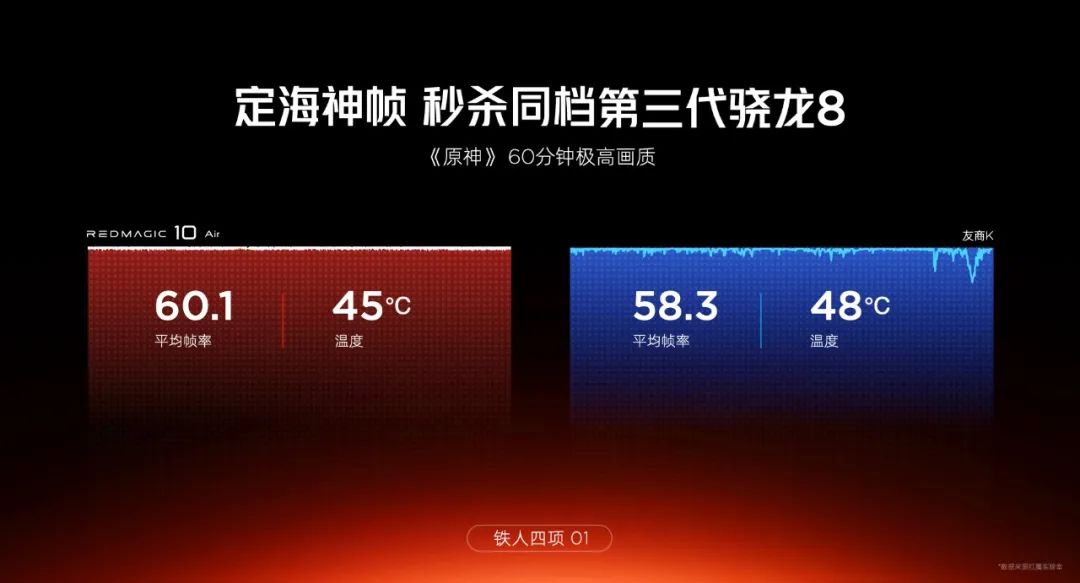 通过游戏实测,红魔10 Air可以实现60分钟《原神》极高画质稳帧运行,越级挑战骁龙8至尊版机型同场景游戏,满帧表现也难分伯仲。值得一提的是,红魔10 Air还支持PC游戏稳帧运行,并获得英雄联盟手游超级联赛、暗区突围先锋杯赛等6大顶级赛事认证,性能稳定性得到专业认可。