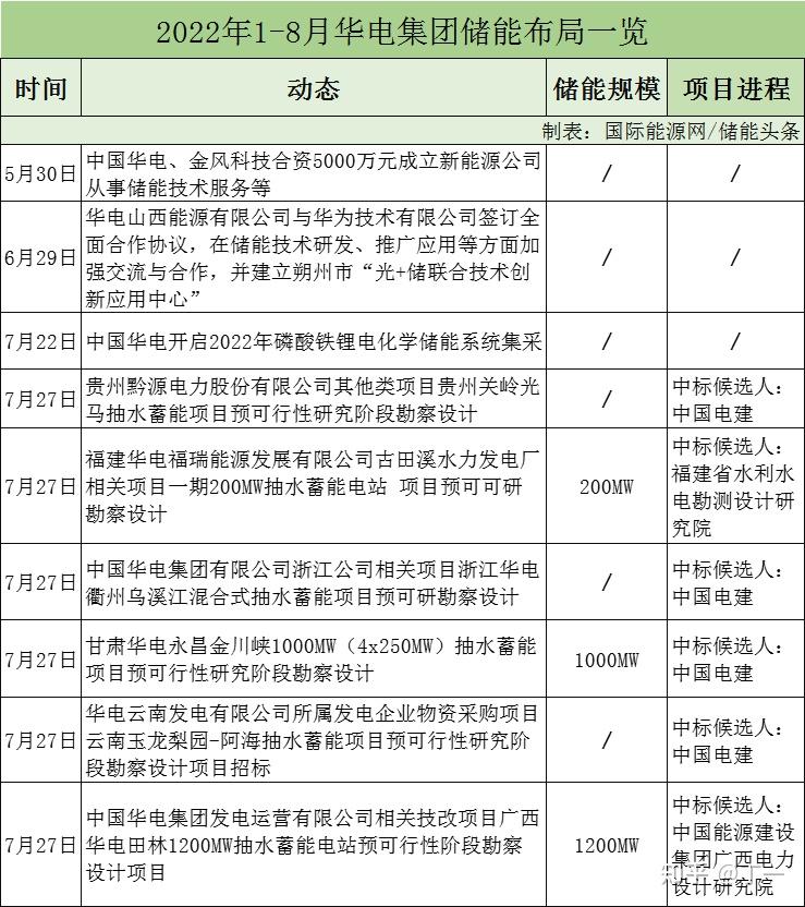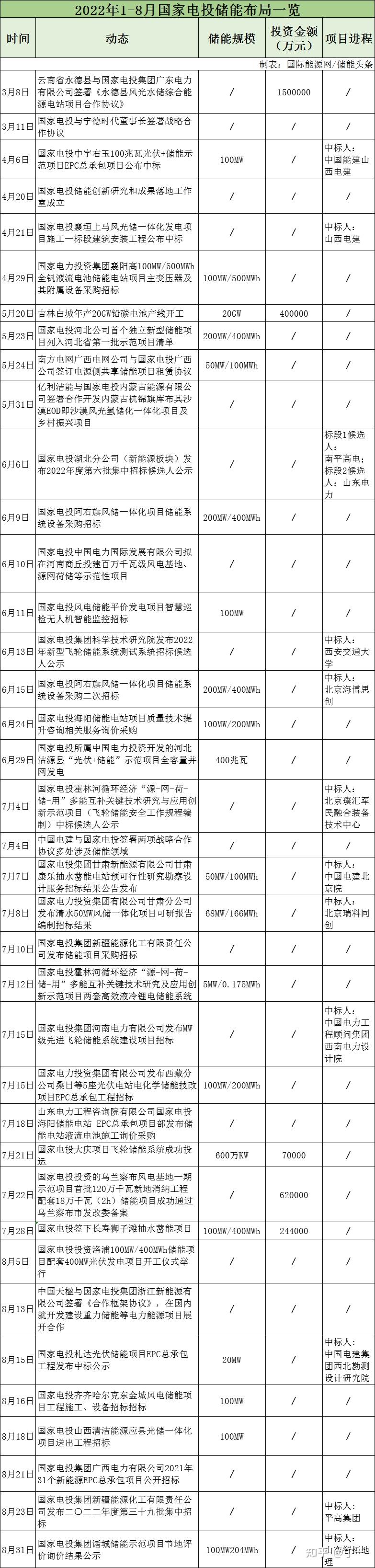 在“双碳”目标推动下,国家多部委、多省地市一系列支持新能源政策随之而来,覆盖共享储能、优先并网、拉大差等多项措施,以提升发电侧、用户侧等配储意愿。行业一派火热。作为构建新型电力系统的基础,以央企为首的发电企业全面进击储能赛道,从战略合作、到各类新型储能项目招标,多元并进、规模超前。01 国家能源集团国家能源集团全称有限责任公司,电力总装机2.38亿千瓦,其中火力发电占全国火电总装机的15.8%,风电装机规模世界第一,广泛应用于集团各个主业。2021年,国家能源集团建设的国家首批大型风电光伏基地项目 1390 万千瓦,位列央企第一;新能源开工 1968 万千瓦、新增装机 1089 万千瓦,均创历史最高水平;集团公司可再生能源装机占比 28.6%,同比提高 2.7 个百分点。据不完全统计,2022年1-8月,国家能源与、山东、浙江等省市围绕新型储能等方面签订,发布项目招标23个,范围涉及储能材料、抽水蓄能、、风电配储、电力辅助服务等领域,储能需求量大。