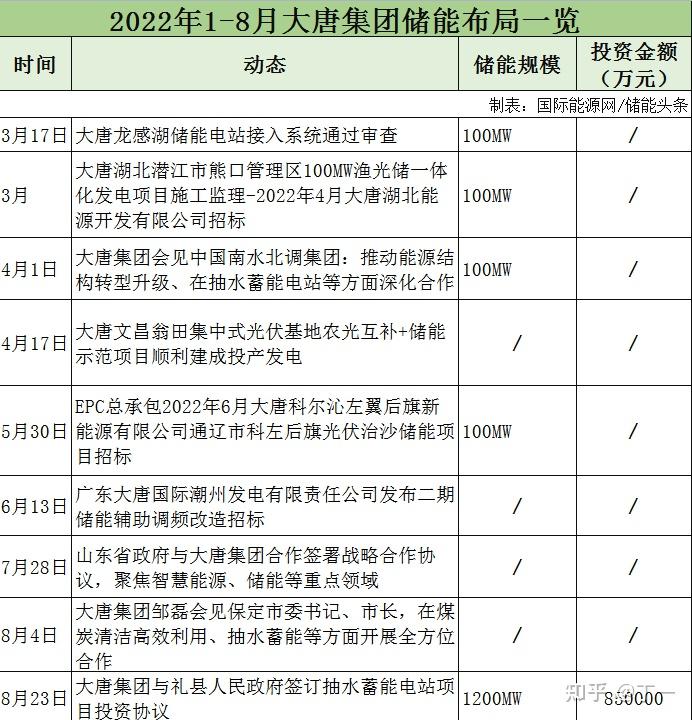 大唐集团也逐步加快了在新能源领域的的发展速度。2021年,中国大唐新能源项目核准(备案)2568.24万千瓦,同比增长242.9%;获取指标2584.05万千瓦,同比增长203.29%;开工676.55万千瓦,同比增长24.14%。与此同时,中国大唐积极融入构建新发展格局,与13个省区市签署11份战略合作协议,与8家中外企业签署绿色低碳战略合作协议,推进与京津冀、长江经济带、黄河流域、大湾区、西部大开发、海南自贸港、“一带一路”等产业合作。据不完全统计,2022年1-8月,大唐集团储能项目招标3个,与山东、保定、等签订合作协议,涉及抽水蓄能、等领域。