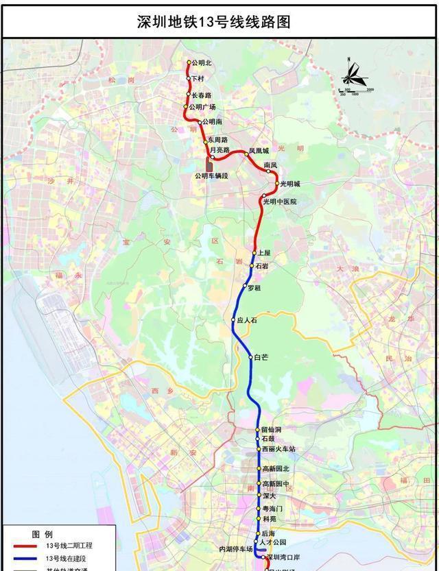 深圳地铁13号线一期一段(深圳湾口岸—高新中)深圳地铁13号线分为一期和二期建设,一期工程全长22.45公里,二期工程19.23公里,二期还有南延线全长4.067公里,线路主要途经深圳的南山区、宝安区。