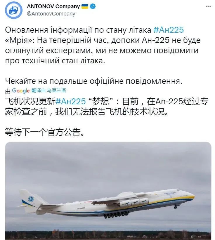 乌克兰安东诺夫公司最新消息:飞机状况更新安-225 “梦想”,目前,在安-225经过专家检查之前,我们无法报告飞机的技术状况。