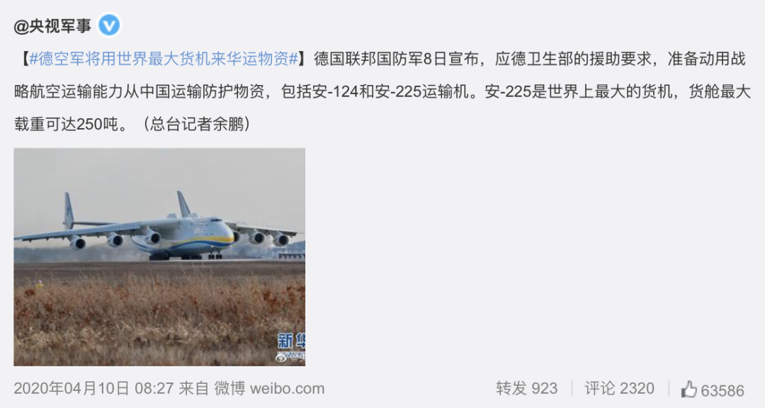 2020年4月14日,安-225从中国满载医疗物资飞抵波兰华沙。