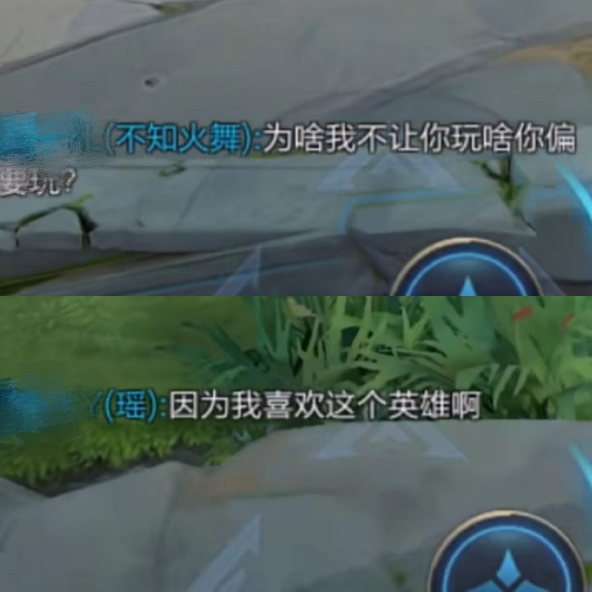这是一局平常的不能再平常的排位,一进入游戏界面就可以很清楚地看到不知火舞和瑶是情侣,毕竟他们的ID都是一样的。刚进入游戏,不知火舞便说话了,为啥我不让你玩啥,你偏要玩啥?很明显他是跟瑶说的。这个时候瑶很委屈地说,因为我喜欢这个英雄啊!