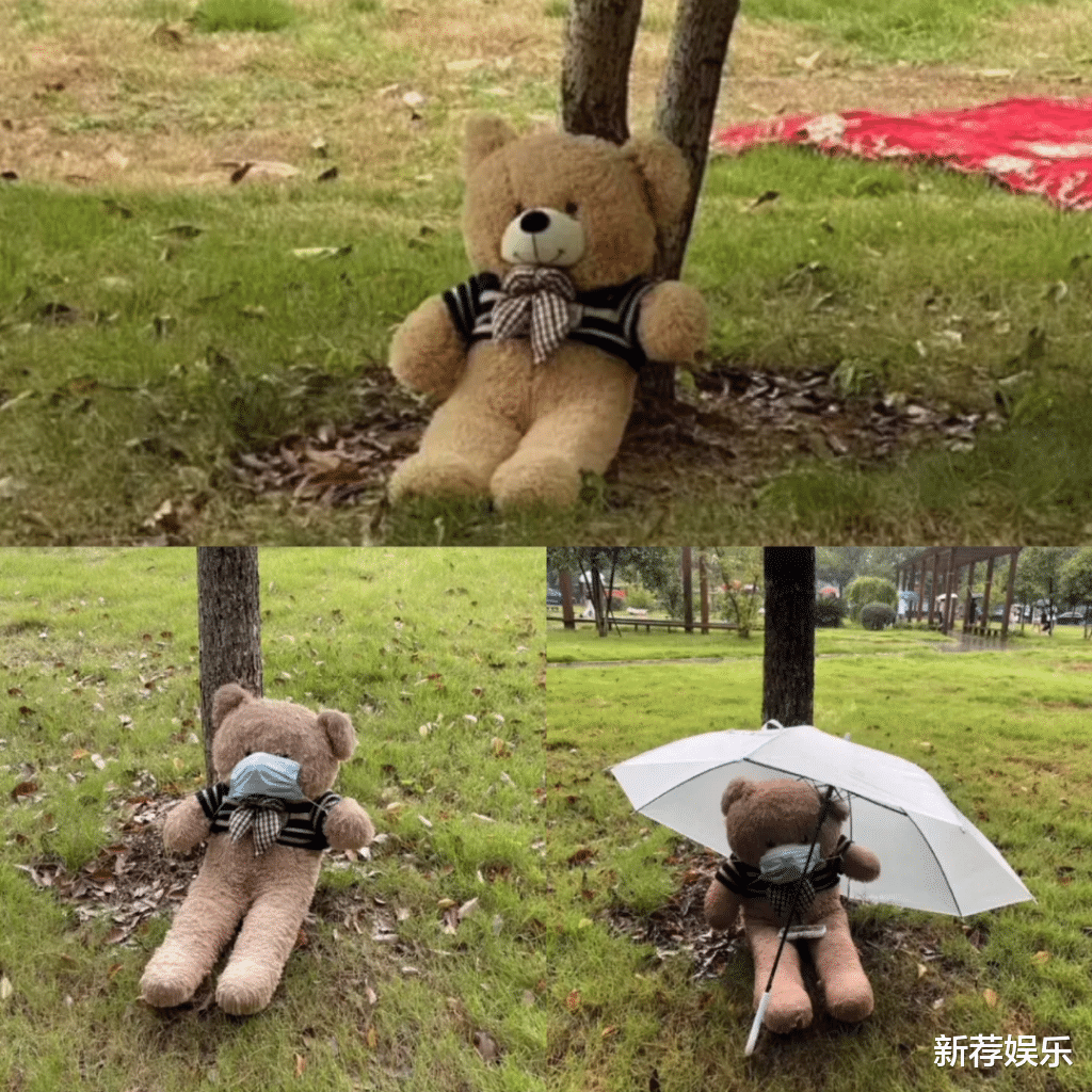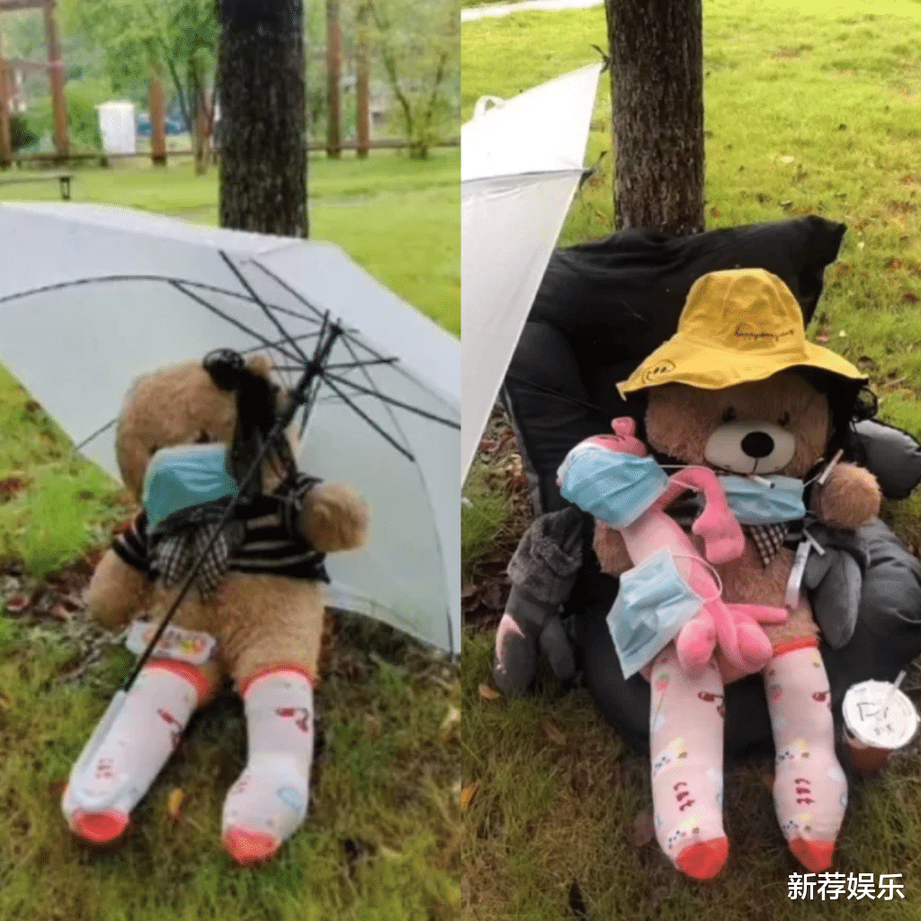 事情是这样的,开学时有同学晒了一个小熊在外面,然后就忘记收回去了,结果就被路过的同学们“照顾”了……同学们都是可爱的人,开始的时候给小熊戴了一个口罩,接着又有人怕它被雨淋撑了一把伞,到最后小熊成为了一个“富有”的熊!