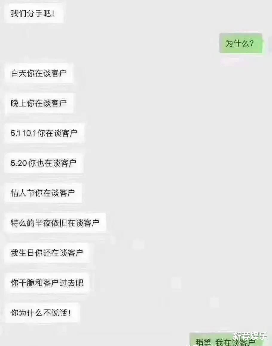 哈哈哈!要这种对象做甚?白天谈客户,晚上还是谈客户,连分手的关键时刻还是在谈客户,那么这个“客户”还真的有点过多了喔~这种人就不该有对象吧?