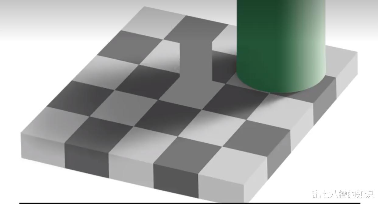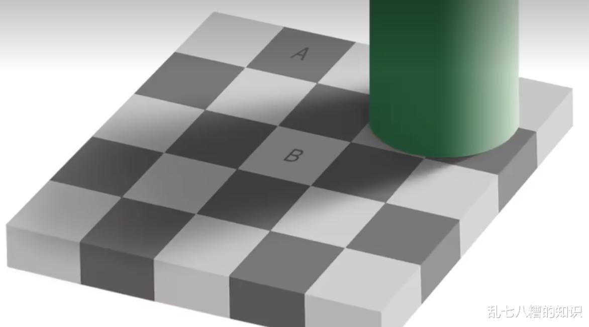 怎么发现这个现象的呢?有一个非常著名的实验,1995年麻省理工的一个叫爱德华阿德尔森的教授做了一个图,这个图叫棋盘暗影错觉,看起来a的区域和b的区域颜色是明显不一样的,但事实上a和b的区域的颜色是一样的,如果用一个颜色把a和b连起来,就会发现a和b是一样的颜色,不知道大家看这个图a和b的颜色是否一样?