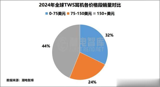 潮电智库数据表示,2024年全球TWS耳机主要以150+美元为销量主体,占总体价格段的44%,0-75美元和75-150美元的占比相对均匀,由此可见,消费者更青睐大品牌、质量有保证的产品。