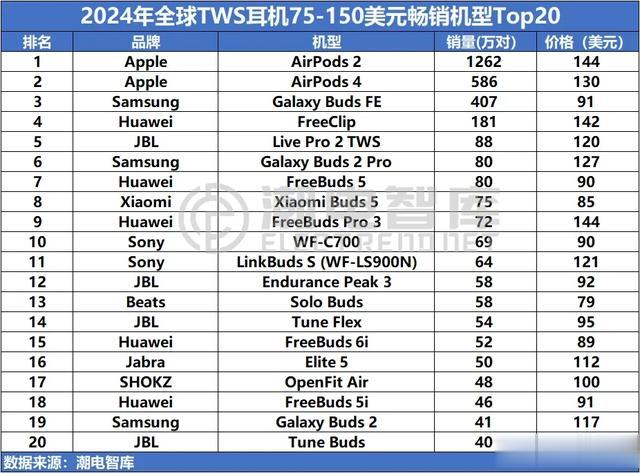 2024年TWS耳机75-150美元畅销机型Top20总体出货量为3412万只,占据机型销量前三的品牌分别是苹果、三星和华为。