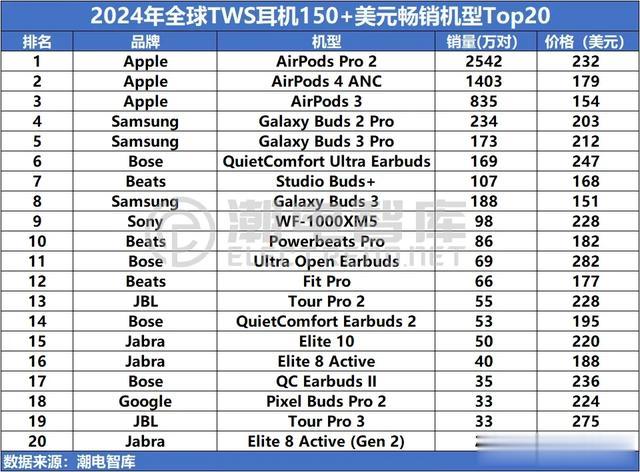 2024年全球畅销TWS耳机150美元+畅销机型TOP20总计出货量6299万只,本价位品牌总销量前三位分别为苹果、三星和BOSE。