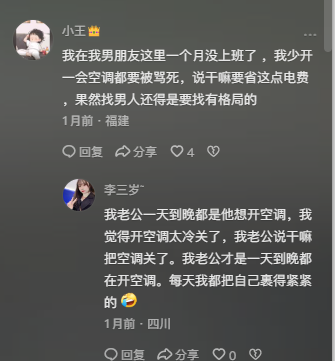 一位来自福建的网友表示自己的男朋友和视频的男子完全相反,自己不开空调反而会被男友骂,她这样说道:“我在我男朋友这里一个月没上班了 ,我少开一会空调都要被骂死,说干嘛要省这点电费 ,果然找男人还得是要找有格局的”。