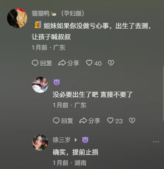 一位来自贵州的网友表示视频的男子说话太难听了,如果是自己的老公这样说话,自己早就上医院不让孩子来到这个世界上了,她这样表示:“就他那句如果检测出来不是他孩子,分分钟上医院,这种男人,不让孩子来到这个世界未尝不是一种善良”。