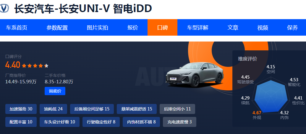 另外,这款车整体的口碑评分为4.40分,网友评价:加速强劲、油耗低、后排空间小、充电速度慢等。