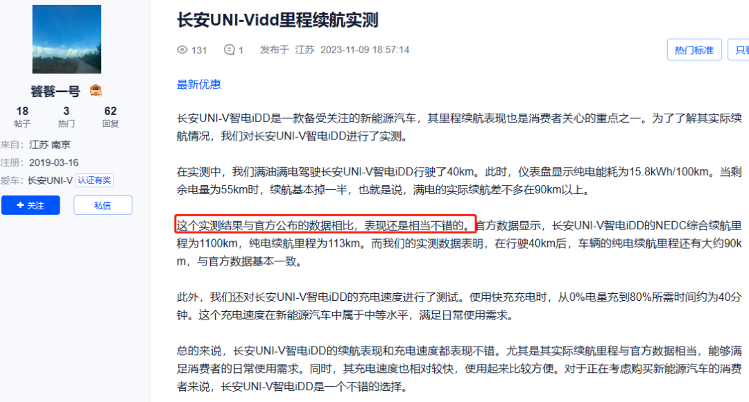 为了进一步了解车主杨女士反映的情况,小编也在网上进行了相关搜索,目前似乎并没有更多长安UNI-V智电iDD车主吐槽续航缩水。