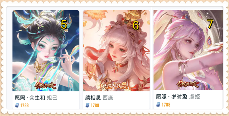 28天:蔡文姬的愿照-福禄聚、妲己的愿照-众生和、澜的愿照-九州拓、女娲的愿照-千秋盛、司空震的愿照-山河定、虞姬的愿照-岁时盈。