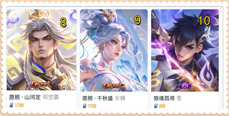 女娲的愿照-千秋盛排在第九,二技能的调整并没有影响到女娲在峡谷里的地位,目前她在巅峰赛的数据是胜率53.1%、出场率9.9%、ban率73.4%。窃以为,如果不是ban率实在太高,千秋盛的销量应该还会更好一点。