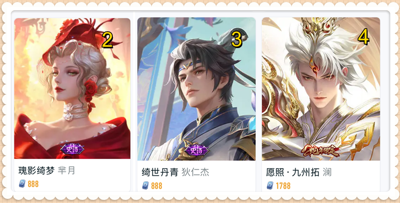 狄仁杰的绮世丹青排在第三,从数据来看,狄仁杰已成为射手三巨头之一(其他两个是苍和虞姬);从皮肤来看,狄仁杰的上一款皮肤还要追溯到23年的11月份,且现在在售的只有超时空战士等上线n年的皮肤,几乎同样的价格,你是选一个25年的新皮肤,还是选一个上线快10年的老皮肤呢?