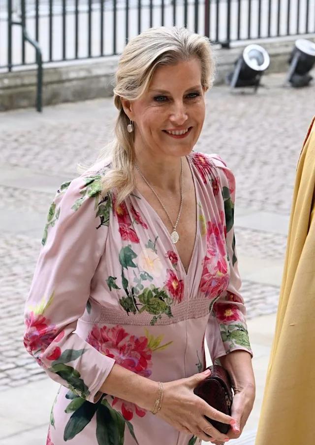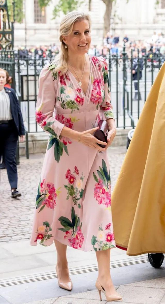 爱丁堡公爵夫人身穿“苏珊娜·伦敦(SuzannahLondon)”设计的粉色碎花茶裙,配以裸色高跟鞋,看起来容光焕发。她把一头金发优雅地盘成半髻,戴着配套的项链和耳环。与此同时,公爵身穿海军蓝西装,系着粉色领带。