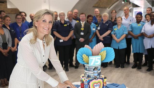 周三上午,公爵夫人为伦敦新的国王学院揭幕,这是一个为护士、助产士和相关医疗专业人员提供教育和培训的中心。国王学院NHS分享的照片显示,索菲穿着一件别致的圆点连衣裙,切着一个五颜六色的分层蛋糕。
