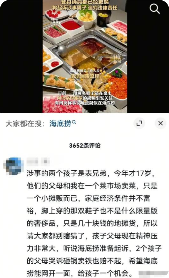 这还不是大头,亏损的大头是来自股价的波动,随便跌几个点就是几亿了,还有品牌价值这些无形的效应。估计海底捞有刀人的心吧!网上的舆论是必须让这俩未成年付出代价,当然其实对于海底捞来说也是乐意见到的,不然后期还出现这种事情咋办呢?虽然概率很小但是架不住有二愣子这么做啊!