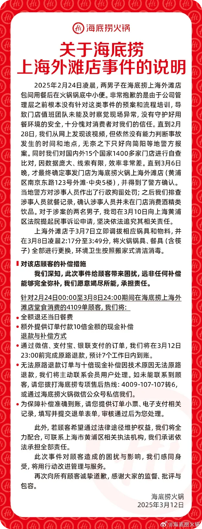 这下子其他地区海底捞的店铺放心了,可以放心的去吃了。不过之前在海底捞上海外滩店吃的顾客来说,从2月24日零点到3月8日24点在这家店铺吃火锅的就可以拿到补偿了,首先是免单,金额原路退回,然后十倍赔偿可以领钱了。当然这也有点恶心,赔偿是必不可少的,不然可会闹事的。