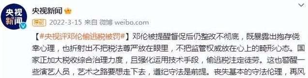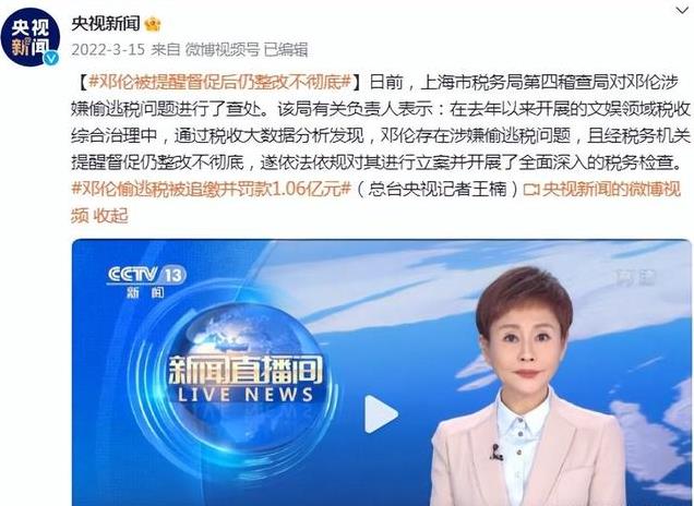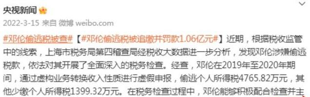 三月十五号,演员邓伦偷税漏税的消息震惊娱乐圈,最终他被罚款并补缴了超过一亿元的税款。