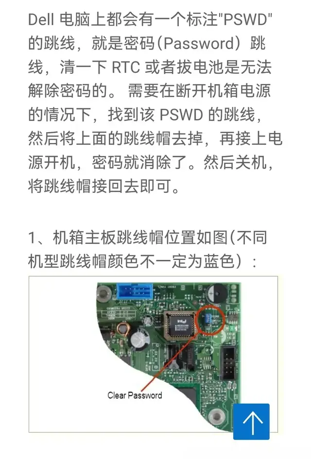 戴尔台式机也有专门的密码清除跳线,单独清除CMOS配置数据是无法清除密码的。戴尔的台式机在主板上会有一个PWD跳线,需要清除密码的时候,需要把跳线冒拔下来,接着再给电脑通电开机,然后关机,还要把PWD跳线冒再装上去就完成了密码清除操作。