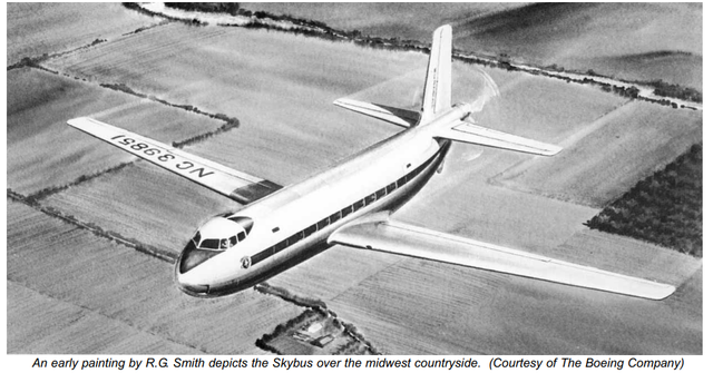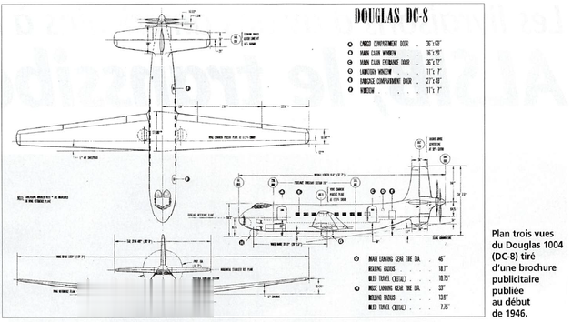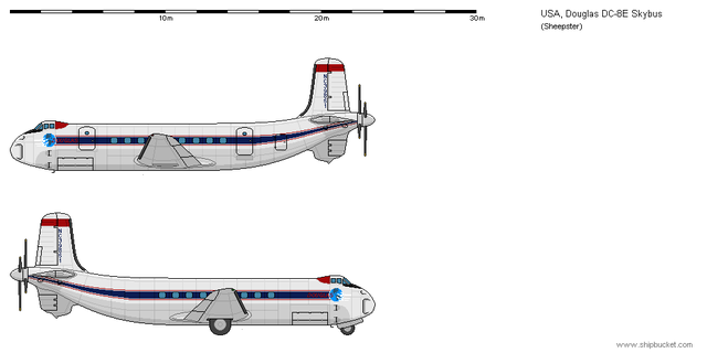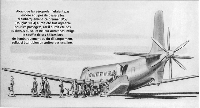 道格拉斯由此提出了DC-8 天空巴士(Skybus)短程客机项目。这个方案内部编号Model 1004,是一种全新设计。和DC-3相比,它可以运载两倍的乘客,而座位英里成本仅为 DC-3 的一半。