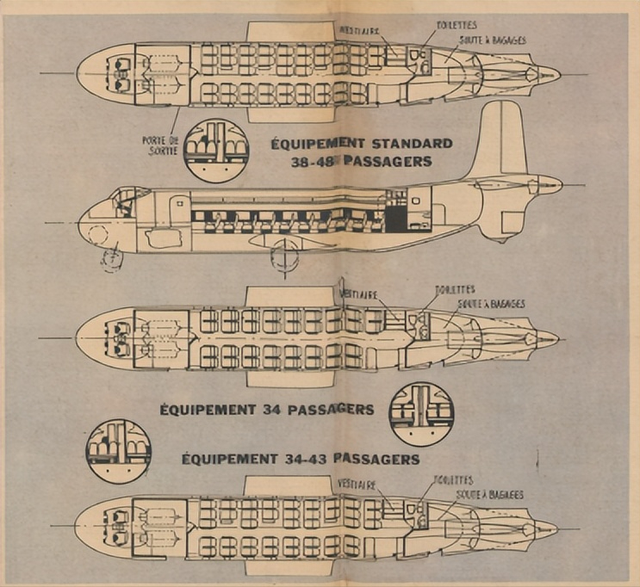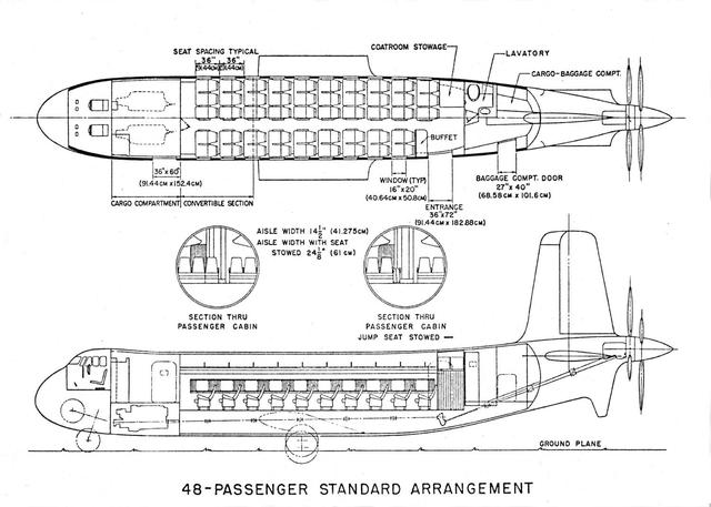一开始采用独特的“双泡”飞行员座舱盖,类似于 XB-42 和 C-74 上的座舱盖,为飞行员提供了卓越的前方、侧面和后方视野(也不知道客机飞行员要后方视野干什么)。后来改为了大型的凸起隔框座舱。机身横截面呈圆形,以便实现加压。但加压仅作为一种可选项。两台发动机驱动的增压鼓风机,加上加热和空调设备,能够在 20,000 英尺的高度维持 8,000 英尺的机舱气压。