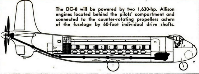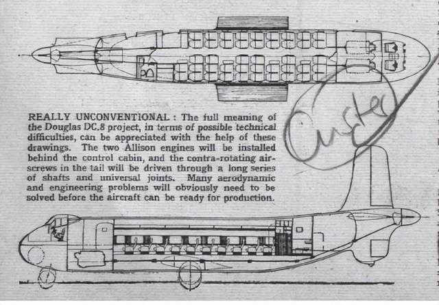 这张档案很有趣, DC-8 的一个前拉后推动力布局方案,类似Do 335