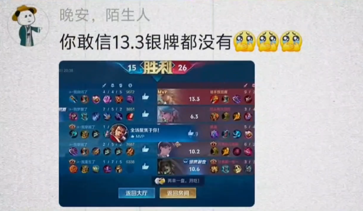 我连续3把败方mvp都是银牌,之后拿了金牌15.0评分,直接加了4星