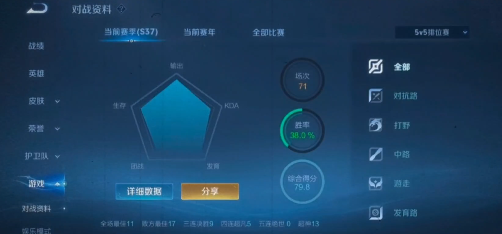 我都懒得玩了。赢一局输一局的。拿了十几个人头血c的对局最后评分还没上十。败方MVP了战绩也是相当好看了平常也是没上十。就知道这个赛季金银牌难拿了。金银牌不掉星只是一个大饼而已。只有虐菜局才有机会拿。势均力敌的局双方想拿个十以上的评分都很难