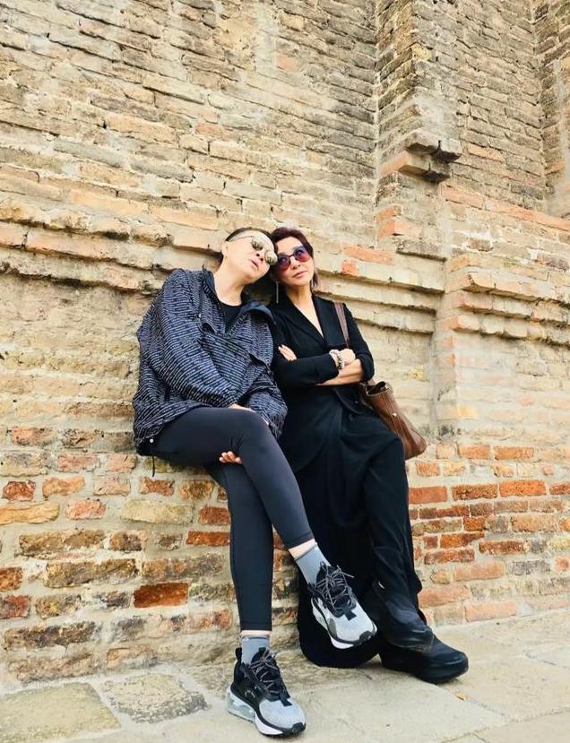 在威尼斯旅行期间,宋丹丹几乎和李静两人形影不离,后来旅行途中李静也换上了白色运动服,不过与好友宋丹丹在一起休息时,李静几乎都是让宋丹丹靠在自己身上,从画面中不难看出,宋丹丹在这次旅行中,显得颇为疲惫,而且颈纹和法令纹也是清晰可见。