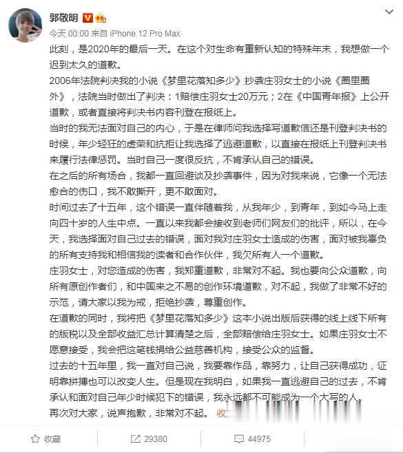 2020年12月31日零点,郭敬明终于发微博就自己所写《梦里花落知多少》一书系抄袭作家庄羽小说《圈里圈外》正式向庄羽道歉,表示后悔在法院判决后不肯承认错误:“庄羽女士,对您造成的伤害,我郑重道歉,非常对不起。”