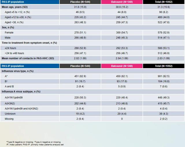 在开展的全球多中心研究中,我们观察到82.5%的病例为甲型流感病毒感染.在甲型流感病毒感染者中,A(H1N1)pdm09型约占49%,A(H3N2)型约占46%。而16.8%的病例为乙型流感病毒感染,这一结果与过去几年流感流行的总体趋势相吻合。参与研究的患者年龄分布显示,5至12岁年龄段的患者占8.2%。玛巴洛沙韦组与安慰剂组的流感患者特征未见显著差异;综合来看,流感患者的平均年龄为31岁,女性患者占总人数的53%。[16]