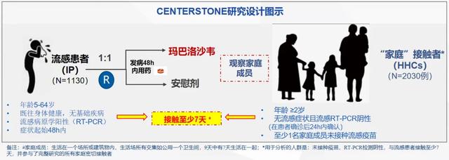 这是一项全球多中心、随机、双盲、安慰剂对照研究(RCT)。研究方法:纳入1130例经核酸确诊的流感患者(排除了需要住院及免疫抑制的流感患者),随机给予玛巴洛沙韦或安慰剂治疗,重点是随访其2030例家庭成员#罹患流感的情况,即家庭内流感传播情况。主要终点:患者用药至第5天,流感PCR阳性的家庭接触者占比(家庭内流感病毒学传播情况);其他次要终点:患者用药至第5天,流感PCR阳性且出现症状的家庭接触者占比;患者用药的安全性(包括不良反应和耐药风险)等。该CENTER STONE研究方法通过RCT研究探索玛巴洛沙韦“阻断传播”的效果。[16]