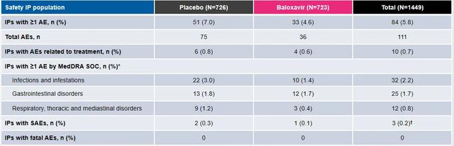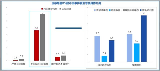 另外一个次要终点:患者应用玛巴洛沙韦后安全性良好,与既往研究一致。【CENTER STONE研究中的流感患者均未发生致死性病例,玛巴洛沙韦组的严重不良事件及治疗相关的不良事件发生率低于安慰剂组;玛巴洛沙韦组常见的不良事件是胃肠道反应,但发生率较低,约1.7%;这些内容与既往临床Ⅲ期研究结论一致。】[16]