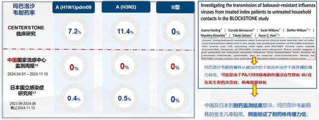 研究中观察到,玛巴洛沙韦耐药率低,且未发生耐药株传播,与真实世界监测结果一致。【玛巴洛沙韦治疗相关的病毒PA/138X位点变异(耐药株),总体发生率约7.2%;研究中对玛巴洛沙韦治疗组的所有家庭接触者(1268例)进行玛巴洛沙韦耐药毒株的检测,未发现耐药毒株的传播。】[16]