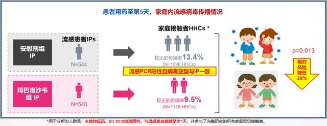 研究的主要终点是玛巴洛沙韦具有阻断传播的效果。研究所示:流感患者用药至第5天,玛巴洛沙韦组流感PCR阳性的人群占比显著低于安慰剂组:9.5% vs 13.4%,p=0.013。玛巴洛沙韦组的家庭内流感传播情况显著优于安慰剂组,即玛巴洛沙韦显著降低了家庭内流感病毒传播的风险 (95% CI, 12–45%)。结论是,与安慰剂相比,玛巴洛沙韦可显著降低29%的家庭内流感传播风险。[16]