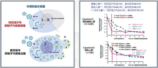 2、多项研究提示玛巴洛沙韦较奥司他韦具有更好的减少流感发病率、改善患者重症率、死亡率方面的效果,可能与玛巴洛沙韦24h内快速降低病毒载量有关;