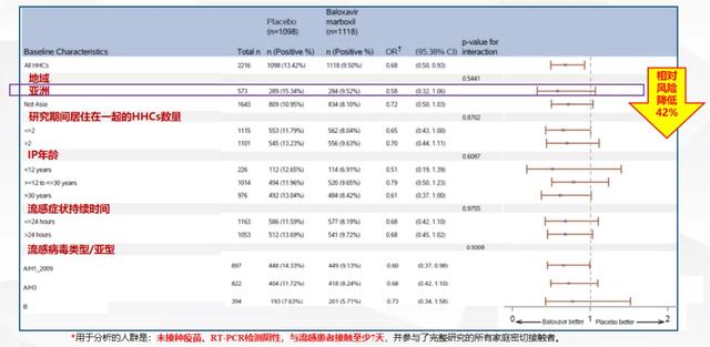 我们也注意到亚组分析:流感患者年龄、发病用药时间,家庭接触者的种族、家庭成员数量的亚组结果与主要终点结果一致。主要终点亚组分析:亚洲流感患者应用玛巴洛沙韦,家庭内流感传播风险降低42%。[16]