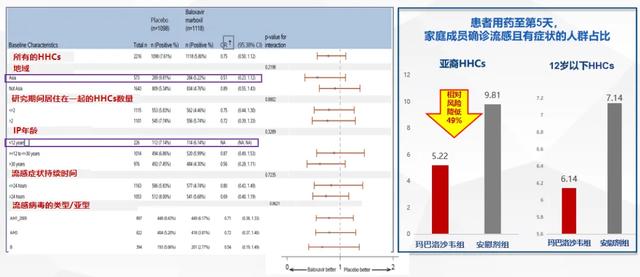 我们也观察到次要终点:至第5天,玛巴洛沙韦组PCR阳性且有症状的HHCs占比较安慰剂组大幅降低。【流感患者用药至第5天,家庭成员流感PCR阳性且出现流感症状的患者占比:玛巴洛沙韦组 vs 安慰剂组 5.80% vs 7.61%,95%CI (0.50,1.12);总体家庭成员发生症状性流感的风险:玛巴洛沙韦组较安慰剂组降低25%,这具有显著临床意义,尤其对于亚洲人群及有孩子的家庭意义更大。】[16]
