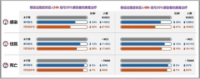 以下是一项流行病学研究基于2017-2018年流感季节在宿主间传播动态的数据模型,评估了不同抗病毒药物治疗覆盖面和不同应用时机对治疗人群流感发病率的影响: