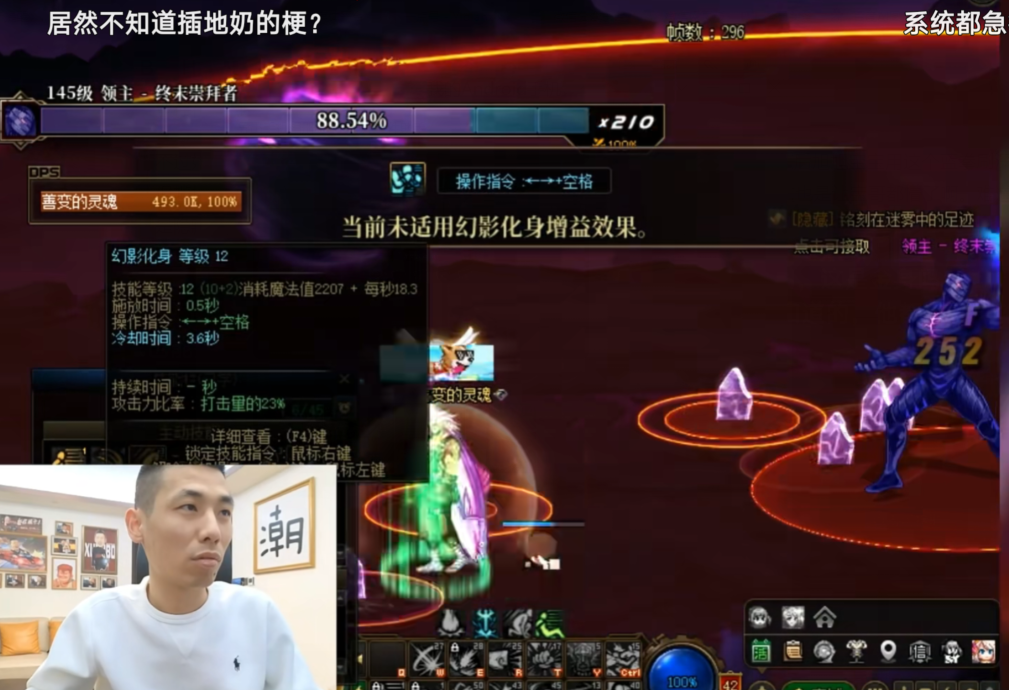但好在旭旭宝宝不愧是十年老玩家,很快就发现不对劲了,于是赶紧根据系统的提示按了左右空格快捷键释放了buff。但即使使用了这个buff还是不能放技能,随后用上下空格往地上插上武器之后至于是可以放技能了。而这也是让宝哥长舒一口气了啊,怕是全服都没有多少玩家知道蓝拳是需要插地才能放技能的吧。