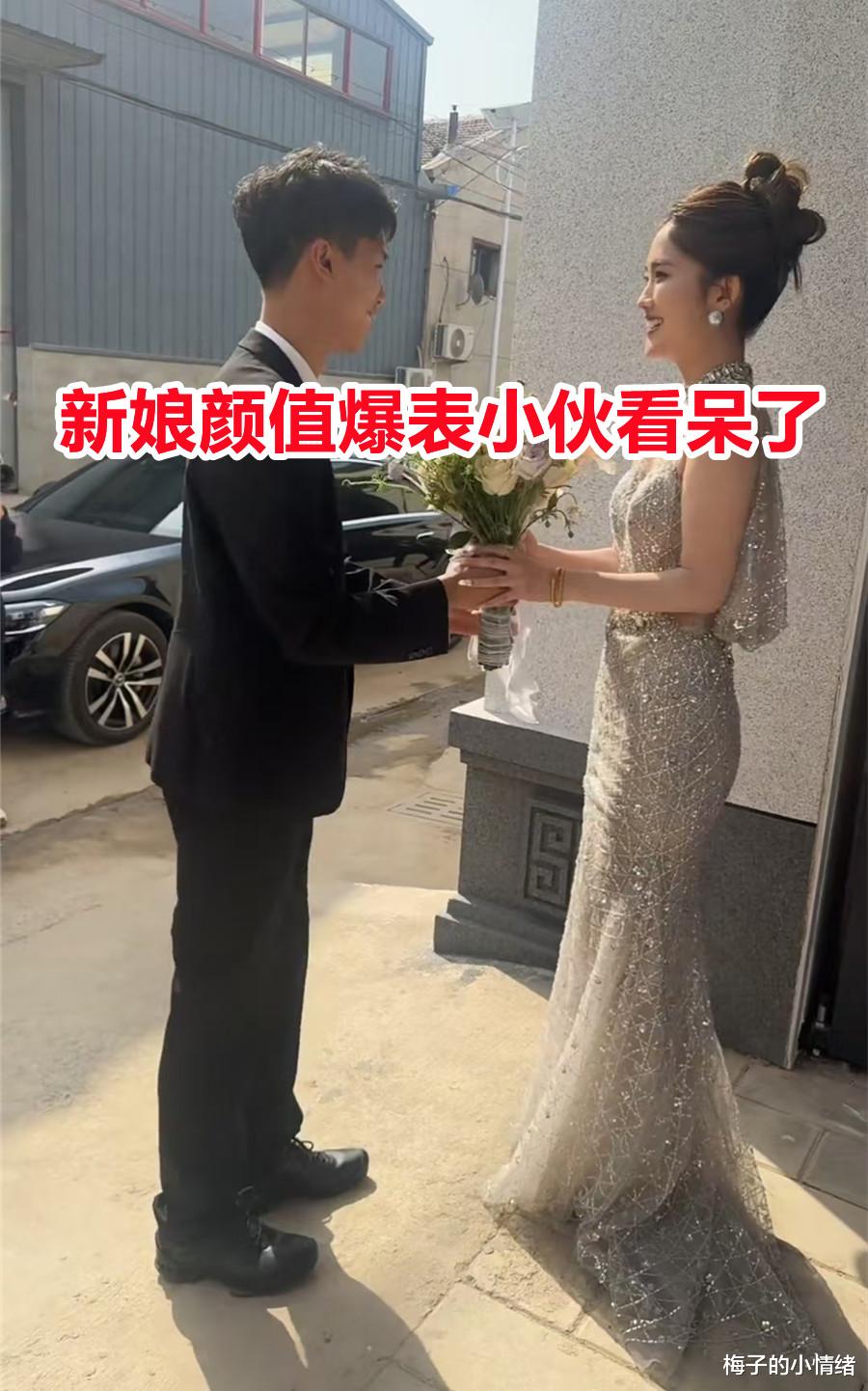 女孩本身就很纤瘦,再加上衣服裁剪得当,更是衬得她肤白貌美、身材婀娜,看到眼前颜值爆表的新娘子,小伙子笑得嘴都合不拢了。